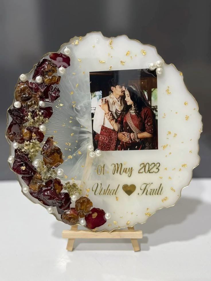 • Handcrafted resin photo frame with soft white and gold detailing.